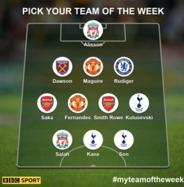 중원 4명은 부카요 사카(아스널), 브루노 페르난데스(맨체스터 유나이티드), 에밀 스미스 로우(아스널), 쿨루셉스키가 선정됐다. 수비는 크레이그 도슨(웨스트햄), 해리 매과이어(맨체스터 유나이티드), 안토니오 뤼디거(첼시)가 이름을 올렸다. 골키퍼는 알리송 베케르(리버풀)이 차지했다.