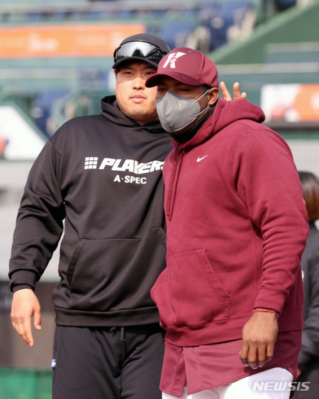 [대전=뉴시스]김주희 기자 = 야시엘 푸이그(32·키움 히어로즈)와 류현진(35·토론토 블루제이스)이 장난하며 웃는 모습은 몇 년전과 다를 바 없었다. 그들이 서 있는 그라운드만 KBO리그로 옮겨왔다.