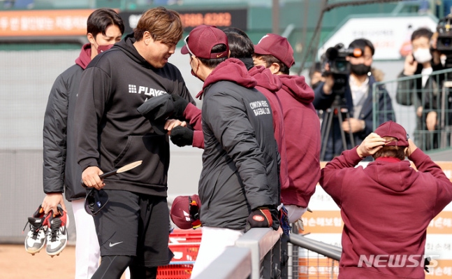 [대전=뉴시스] 김병문 기자 = 4일 대전 한화생명 이글스파크에서 열린 한화 이글스와 키움 히어로즈 연습경기에 앞서 한화의 스프링캠프에 참여한 토론토 블루제이스 류현진이 키움 선수들에게 인사를 나누고 있다. 2022.03.04.