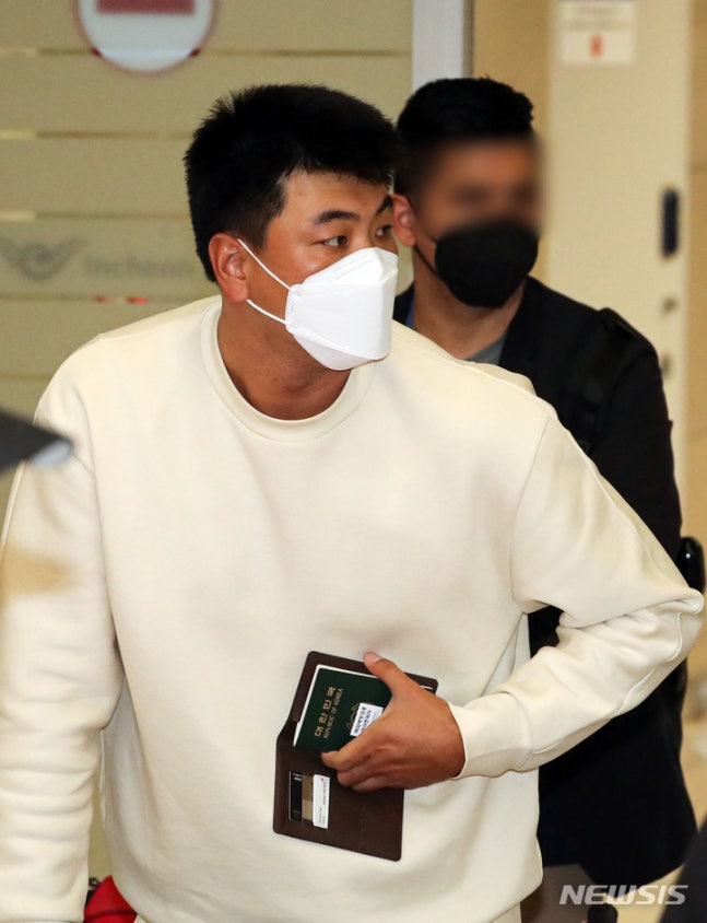 [인천공항=뉴시스] 권창회 기자 = 미국 메이저리그 두번째 시즌을 마친 세인트루이스 카디널스의 김광현이 11일 오후 인천국제공항 제2여객터미널을 통해 귀국하고 있다. 2021.10.11.