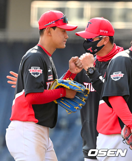 [OSEN=창원, 최규한 기자] 12일 창원NC파크에서 열린 ’2022 신한은행 SOL KBO리그’ 시범경기 개막 NC 다이노스와 KIA 타이거즈의 경기, 방문팀 KIA가 7-0 완승을 거두며 기분 좋은 시작을 알렸다.승리한 KIA 김종국 감독과 김도영이 인사를 나누고 있다. 2022.03.12