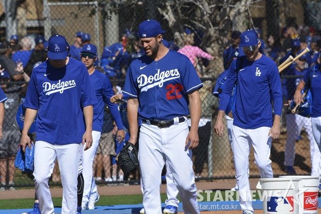 18일(한국시간) 스프링캠프에서 훈련장으로 이동하고 있는 커쇼(가운데). /사진=이상희 통신원