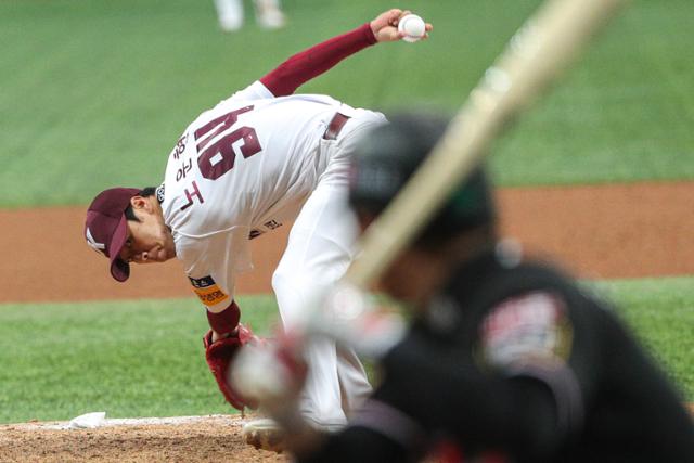 키움 노운현이 29일 서울 고척스카이돔에서 열린 KT와 경기에서 독특한 투구 폼으로 역투하고 있다. 뉴스1
