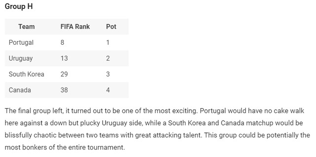 <더 스포팅 뉴스>는 이번 대회에 출전하는 32개 팀을 대상으로 본선 조추첨을 예상했다. 당연히 한국이 속한 그룹도 있었다. <더 스포팅 뉴스>는 한국이 대회 H조에 배정될 것이라고 예상했다. 그리고 이 H조에는 한국을 비롯해 포르투갈·우루과이·캐나다가 자리했다.