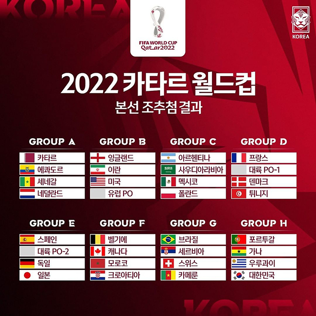 지난 2일(한국시간) 카타르 도하에서 열린 2022 카타르 월드컵 조 추첨식을 통해 한국은 포르투갈과 우루과이, 가나와 같은 조에 속했다. 조 추첨 전부터 가장 피해야 할 팀들로 꼽혔던 브라질이나 프랑스(이상 포트1) 독일, 네덜란드(이상 포트2) 캐나다, 유럽 플레이오프(PO·이상 포트4) 등을 모두 피했다. 안정환 MBC 해설위원의 표현대로 '해볼 만하다'는 평가가 지배적이다.