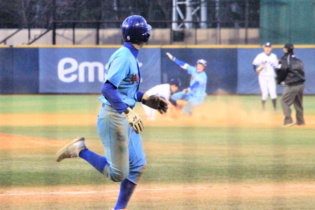 | ▲ 부산고의 박찬엽 선수가 홈으로 쇄도하면서 2루에서 펼쳐진 접전 상황을 지켜보고 있다. |