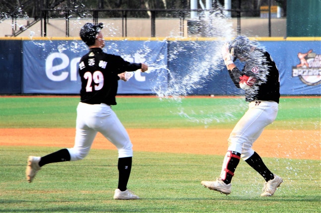 | ▲ 배명고와의 16강전에서 끝내기 안타를 친 장충고 류현준 선수(오른쪽)이 원종해 선수에게 물세례를 맞고 있다. |