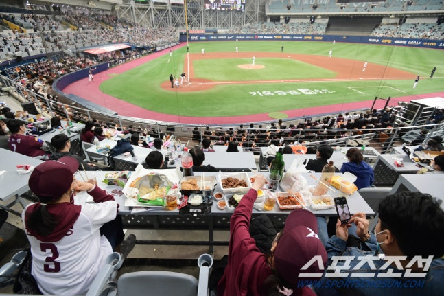 2일 서울 고척스카이돔. 롯데 자이언츠와 키움 히어로즈 경기. 야구팬들이 많은 음식을 먹으며 경기를 관람하고 있다. 하지만 문화체육관광부가 고척돔에서의 음식물 취식을 금지하기로 함에 따라 개막전 2경기 후엔 다시 취식이 금지된다. 고척=정재근 기자