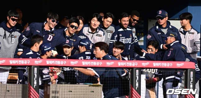 이어진 2사 2루 기회. 두산의 안재석이 정우영을 상대로 중전 역전 적시타를 쳐냈다. 계속해서 이유찬이 몸에 맞는 볼로 출루하며 1, 2루가 됐고, 정수빈이 바뀐 투수 유영찬을 상대로 중월 2타점 적시 3루타를 치며 7-4까지 달아났다. 사실상 승부에 쐐기를 박는 적시타. 더그아웃에 있던 이승엽 감독은 마치 진짜 현역으로 뛰는 선수처럼 팔을 크게 휘저은 뒤 기뻐하며 포효했다. 이후 두산은 조수행과 양석환의 연속 볼넷에 이어 유영찬의 폭투로 한 점을 추가한 뒤 김재환이 또 볼넷을 골라냈다. 이어 양의지가 좌익선상 안쪽에 떨어지는 2타점 적시 2루타로 승부에 쐐기를 박았다.