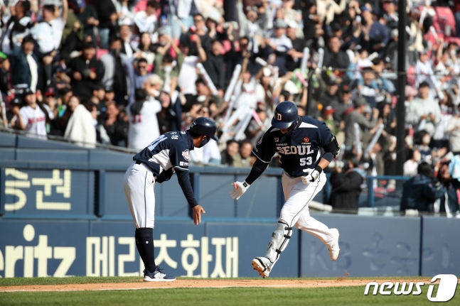두산 양석환(오른쪽)이 7회 동점 3점포를 친 뒤 그라운드를 돌고 있다. /사진=뉴스1