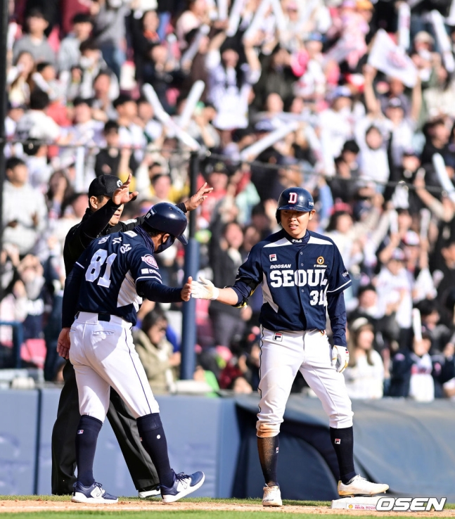 두산도 반격했다. 2회 다시 한번 뛰었다. 1사 후 송승환이 중전 안타로 출루한 뒤 후속 강승호 타석 때 임찬규의 폭투를 틈타 2루까지 갔다. 여기서 만약 아웃이 됐다면 경기 초반부터 흐름이 완전히 LG로 넘어갈 수도 있었던 순간. 이후 강승호의 좌중간 안타로 1,3루를 만들었고, 안재석의 2루 땅볼 때 3루주자 송승환이 홈을 밟았다. 1-1 원점.