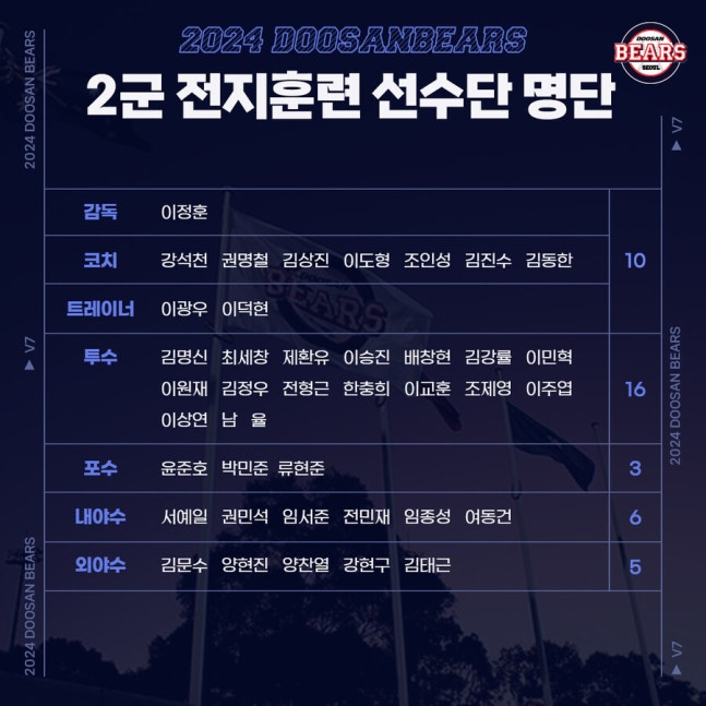 2군 스프링캠프에 참가하는 두산 선수단은 오는 5일 인천국제공항에서 일본 미야코지마로 출국한다. 참가 인원은 이정훈 감독을 포함한 코칭스태프 10명, 선수 30명 등 총 40명이다.