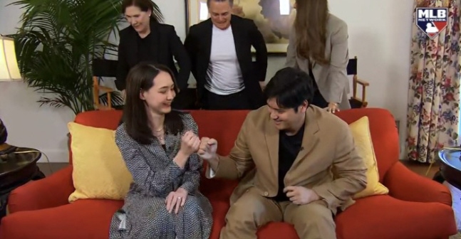 오타니 쇼헤이가 MVP 발표 직후 자태게서 MLB 네트워크 인터뷰에 아내와 함께 등장해 서로 주먹을 맞대고 기뻐하고 있다.