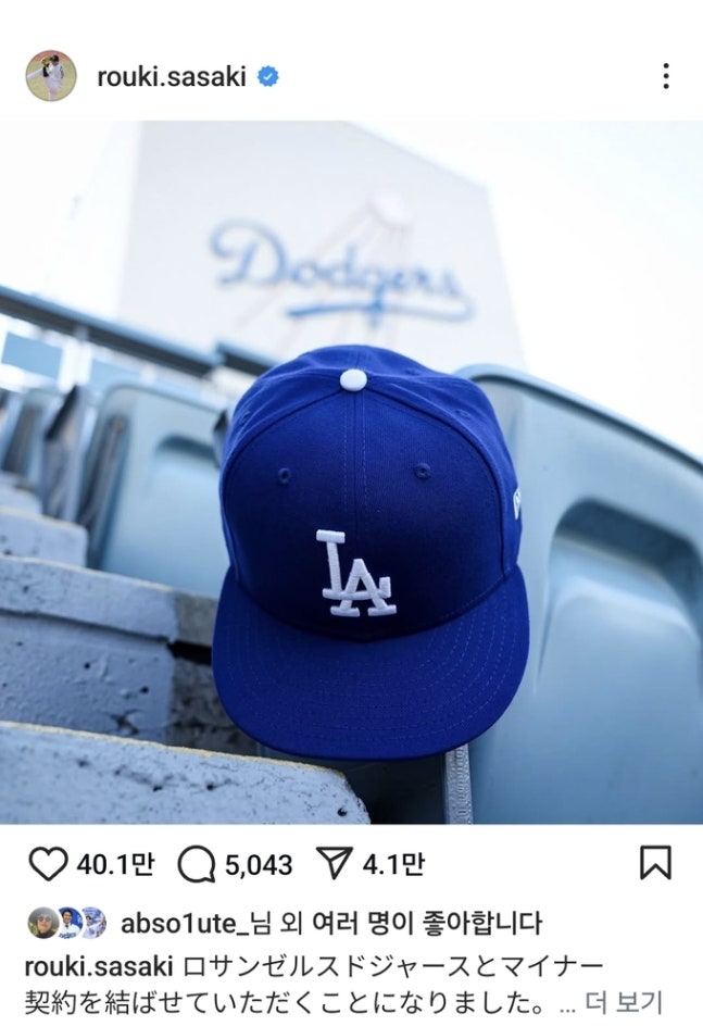 사사키는 18일(한국시간) 자신의 사회관계망서비스(SNS) 인스타그램에 다저스 모자 사진과 함께 “다저스와 마이너 계약을 맺었다. 무척 어려운 결정이었지만, 나중에 야구 일생을 마치고 돌아봤을 때 옳은 결정이었다고 생각할 수 있도록 노력하겠다”고 밝혔다. 이어 “입단 기자회견에서는 지금까지 응원해주신 모든 분께 감사드리며, 다저스 유니폼을 입고 싶다고 말하고 싶다”고 덧붙였다.