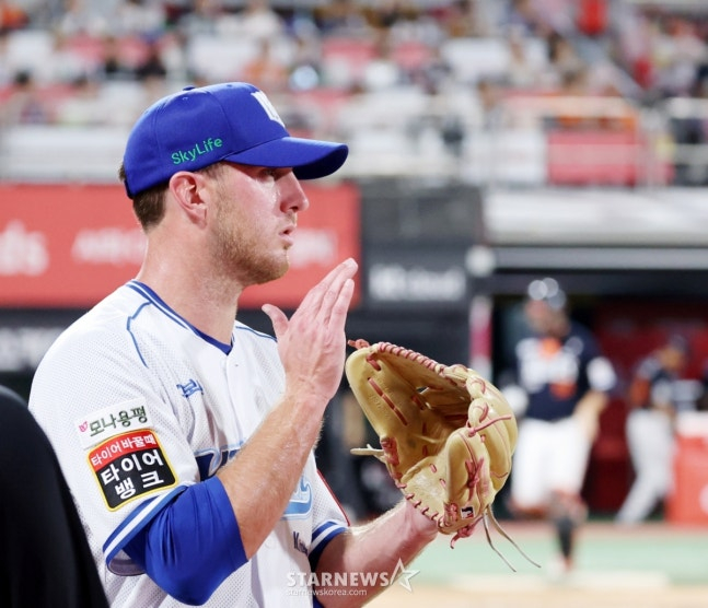 KT 새 외국인 투수 패트릭 머피가 18일 수원 한화전에서 투구 후 내려왔다. /사진=강영조 선임기자