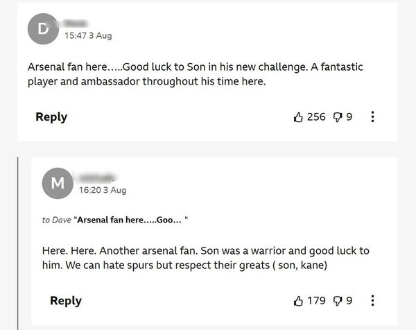 한 팬은 자신이 아스널 팬임을 밝히며 "손흥민은 환상적인 선수이자 토트넘의 훌륭한 홍보대사였다"고 적었다. 또 다른 팬은 "토트넘은 싫어해도 손흥민은 미워할 수 없다"며 "그는 진정한 전사였다"고 평가했다.