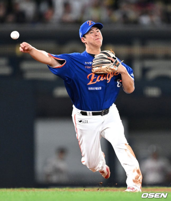 [OSEN=광주, 이대선 기자] 4회말 2사에서 한화 노시환이 KIA 오선우의 땅볼 타구를 잡아 송구를 하고 있다. 2025.08.01