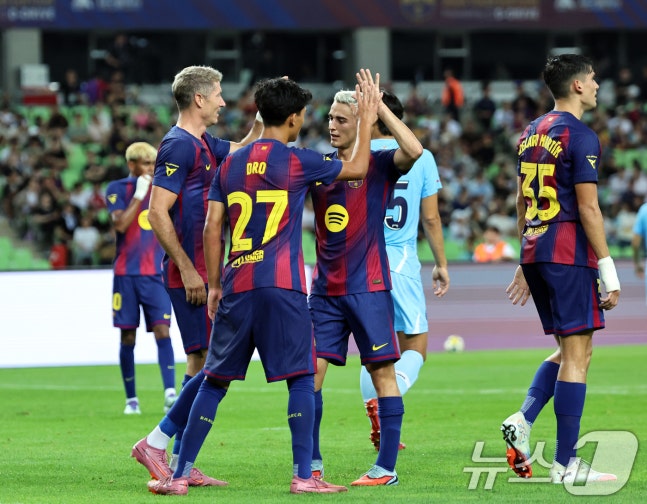 4일 오후 대구 수성구 대구스타디움에서 열린 '2025 FC바르셀로나 아시아투어' 대구FC와 FC바르셀로나의 경기에서 전반 FC바르셀로나 레반도프스키가 팀의 두번째 골을 넣은 뒤 동료들과 기쁨을 나누고 있다. 2025.8.4/뉴스1 ⓒ News1 구윤성 기자