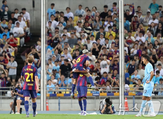 4일 오후 대구 수성구 대구스타디움에서 열린 '2025 FC바르셀로나 아시아투어' 대구FC와 FC바르셀로나의 경기에서 전반 FC바르셀로나 가비가 선취골을 넣은 뒤 기쁨을 나누고 있다. 2025.8.4/뉴스1 ⓒ News1 구윤성 기자