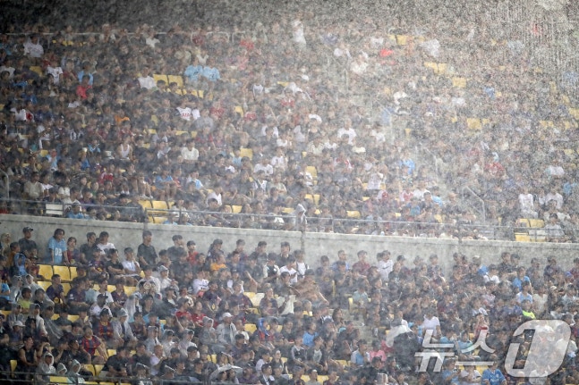 4일 오후 대구 수성구 대구스타디움에서 열린 '2025 FC바르셀로나 아시아투어' 대구FC와 FC바르셀로나의 경기, 비가 내리는 가운데 경기장을 찾은 축구팬들이 양팀의 경기를 지켜보고 있다. 2025.8.4/뉴스1 ⓒ News1 공정식 기자