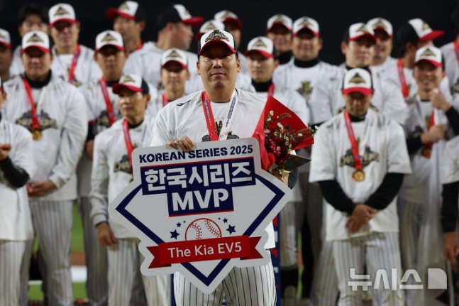 [대전=뉴시스] 김근수 기자 = 31일 대전 중구 한화생명볼파크에서 열린 2025 KBO 한국시리즈 5차전 LG 트윈스와 한화 이글스의 경기에서 4승 1패 기록으로 통합 우승을 차지한 LG 김현수가 한국시리즈 MVP를 수상하고 있다.