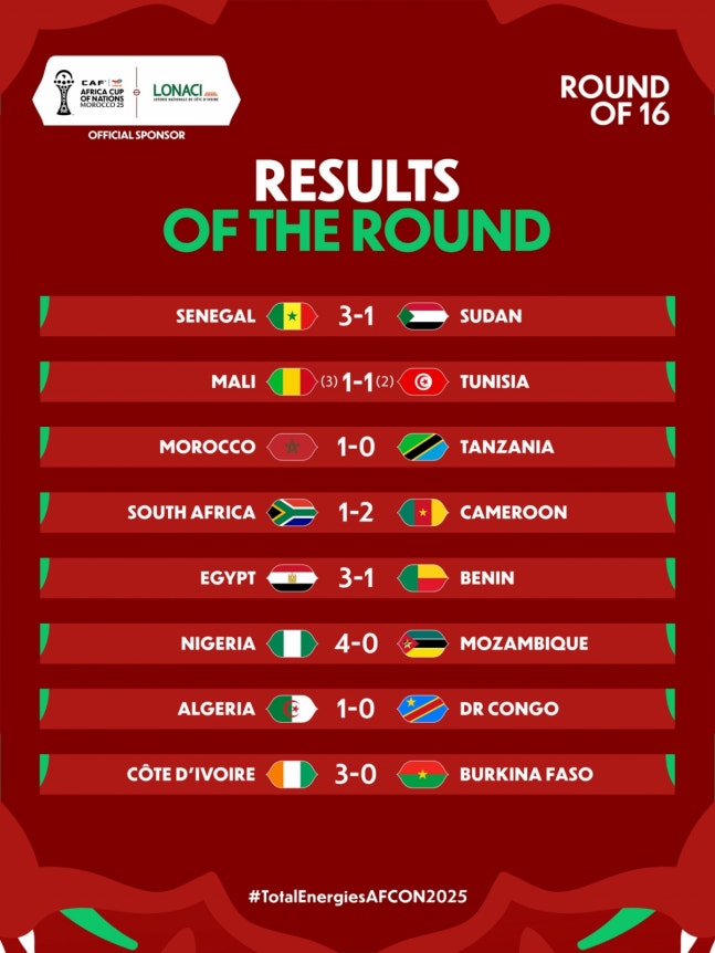 2025 아프리카 네이션스컵 16강 결과. /사진=아프리카 네이션스컵 SNS 캡처