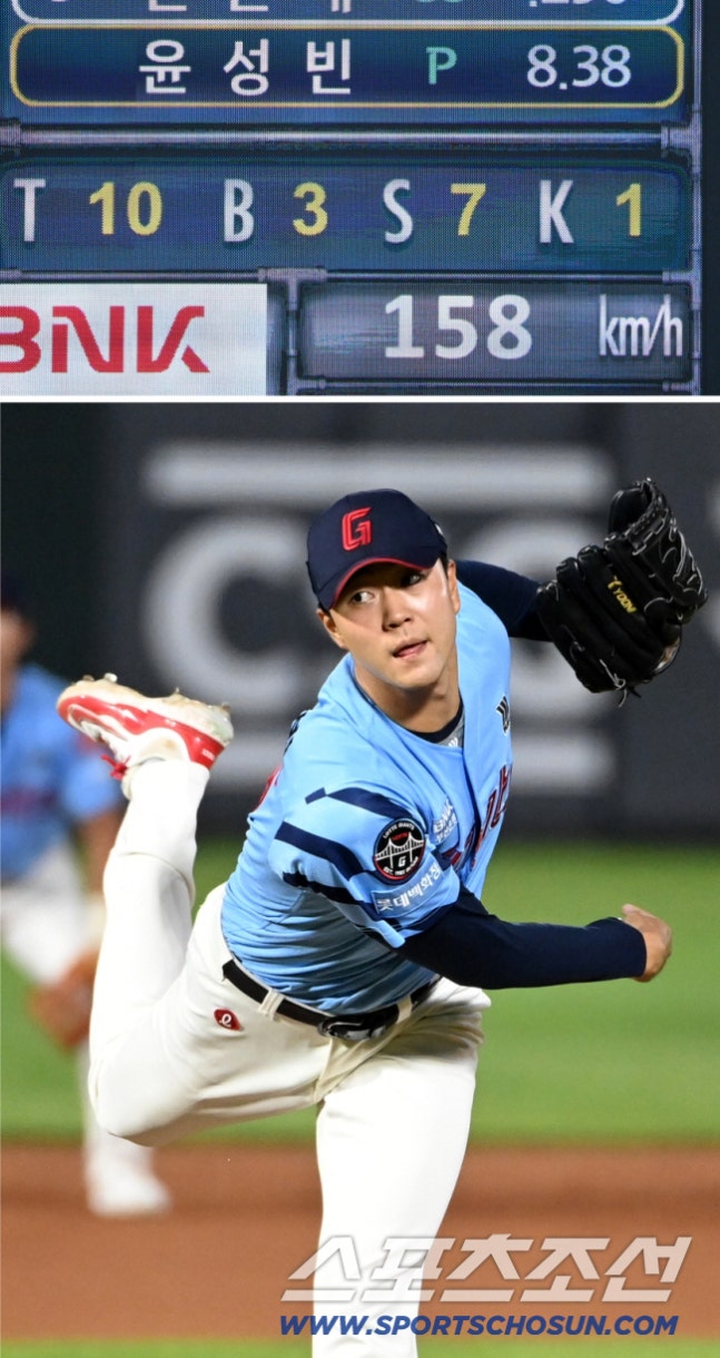 8일 부산 사직야구장에서 열린 SSG와 롯데의 경기, 8회초 롯데 윤성빈이 SSG 최정을 상대로 던진 직구의 구속 158Km가 전광판에 나타나고 있다. 부산=허상욱 기자[email protected]/2025.08.08/