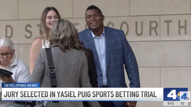 아내와 함께 법정에 나선 야시엘 푸이그가 미소를 짓고 있다. /NBC4 방송 화면