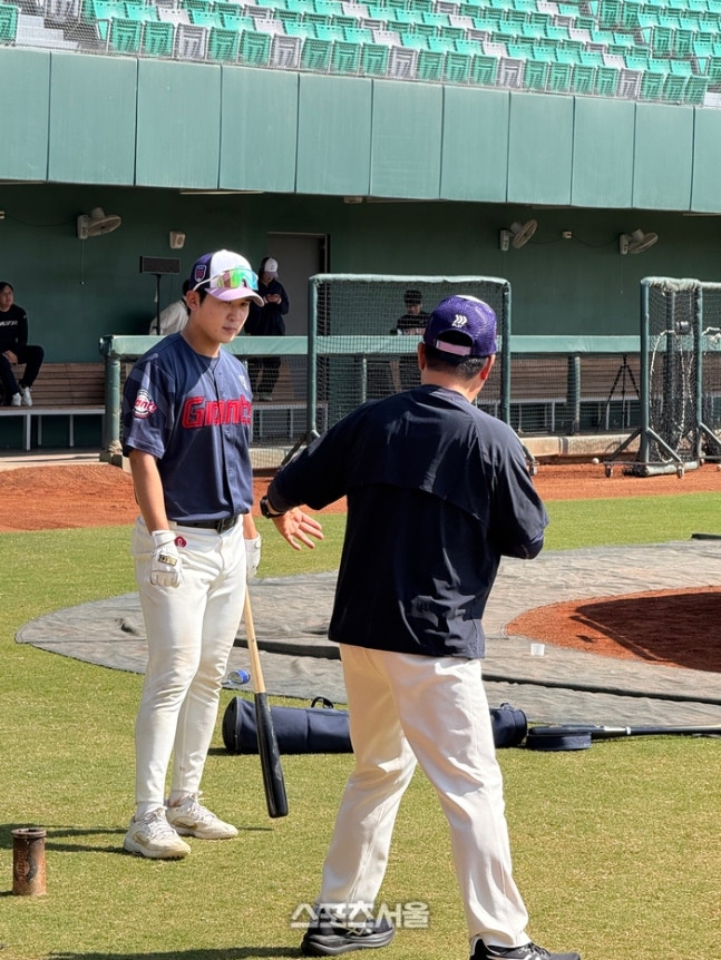 | 김태형 감독이 김세민 타격 지도를 하고 있다. 타이난 | 박연준 기자 [email protected] |