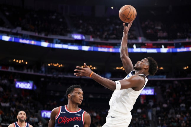 앤서니 에드워즈(오른쪽)가 12일 미국 캘리포니아주 잉글우드의 인튜이트돔에서 열린 LA 클리퍼스와 2025~2026 미국프로농구 정규리그 원정 경기에서 슛하고 있다. 잉글우드 | AP연합뉴스