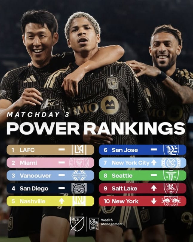 메이저 리그 사커(MLS) 사무국은 11일(이하 한국시각) 공식 채널을 통해 2026년 MLS 3라운드 파워랭킹을 공개했다. 그 결과 손흥민이 속한 LA FC가 이번에도 1위에 이름을 올렸다. 2위는 이번에도 리오넬 메시가 버티는 인터 마이애미였다.