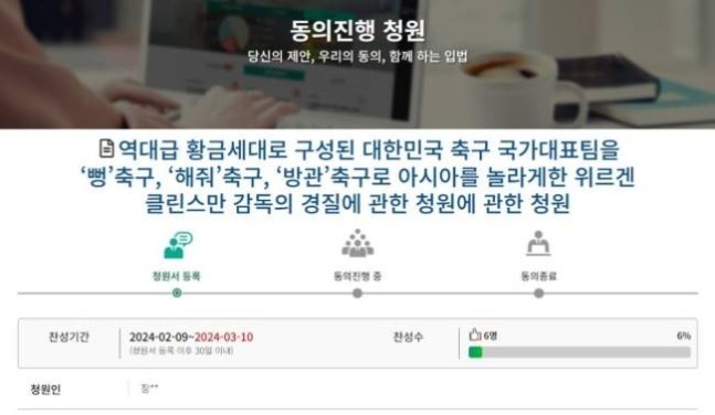 당시 국민청원까지 등장했다. 9일 국민동의청원 홈페이지에 "역대급 황금세대로 구성된 대한민국 축구 국가대표팀을 '뻥' 축구, '해줘' 축구, '방관' 축구로 아시아를 놀라게 한 클린스만 감독의 경질에 관한 청원"이라는 제목의 글이 올라왔다.
