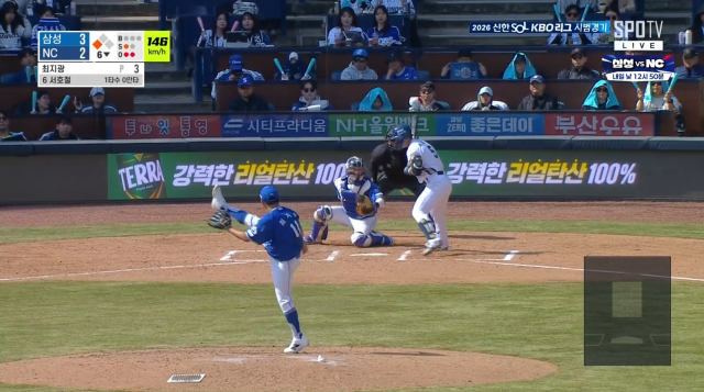 1사 3루 위기 상황에서 마운드에 올랐다. 5회 선두타자 박건우가 2루타를 쳤다. 선발 왼손 이승현은 박시원을 중견수 뜬공으로 잡았다. 대주자로 들어온 오영수가 3루에 안착했다. 여기서 최지광이 마운드에 오른 것.