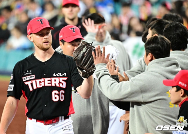 [OSEN=대구, 지형준 기자] 25일 대구삼성라이온즈파크에서 2024 신한 SOL뱅크 KBO 한국시리즈 3차전 삼성 라이온즈와 KIA 타이거즈의 경기가 열렸다.삼성은 대니 레예스, KIA는 에릭 라우어를 선발 투수로 내세웠다.경기에 앞서 KIA 라우어가 동료선수들과 하이파이브를 하고 있다. 2024.10.25 / [email protected]