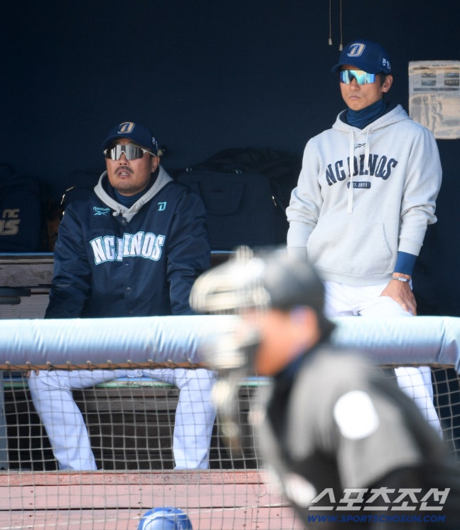 15일 마산야구장에서 열린 NC 다이노스와 키움 히어로즈의 시범경기. NC 이호준 감독, 김경태 코치가 경기를 지켜보고 있다.