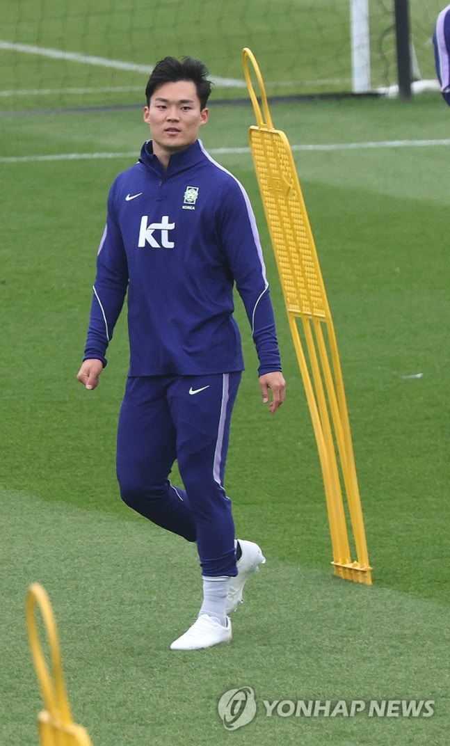 (밀턴킨스[영국]=연합뉴스) 최재구 기자 = 코트디부아르전을 앞둔 한국 축구 국가대표팀의 오현규가 24일(현지시간) 영국 런던 북서쪽 밀턴킨스에서 팀동료들과 훈련하고 있다. 2026.3.25 [email protected]