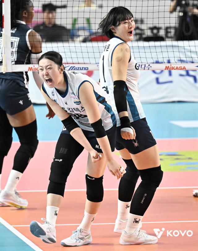 권민지(왼쪽)와 최가은이 1일 경북 김천실내체육관에서 열린 2025~26시즌 진에어 V리그 여자부 챔피언결정전 1차전에서 한국도로공사를 상대로 공격에 성공한 뒤 환호하고 있다. 한국배구연맹 제공