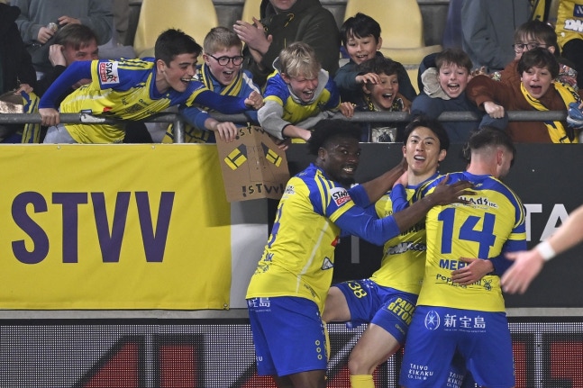신트트라위던 미드필더 마쓰자와 카이토(가운데)가 지난 3월 8일 벨기에 신트트라위던 다이오 와사비 스타이언 스타디움에서 열린 세르클 브뤼헤와의 프로리그 경기에서 팀의 두 번째 골을 넣은 뒤 동료들과 기뻐하고 있다. AFP