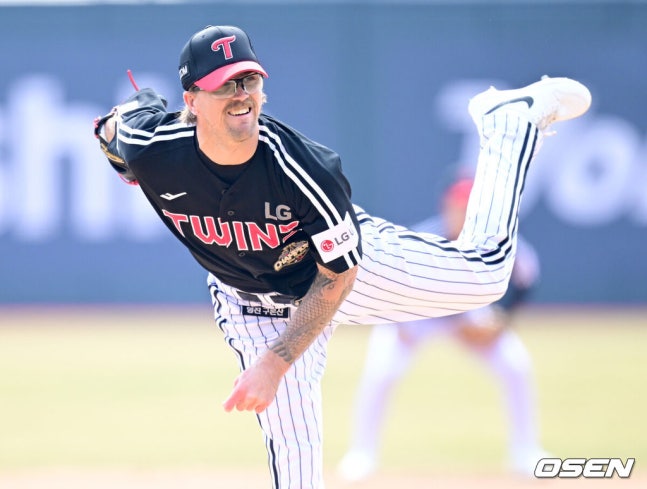 [OSEN=수원, 최규한 기자] 16일 경기도 수원 KT위즈파크에서 ‘2026 신한 SOL KBO리그’ 시범경기 KT 위즈와 LG 트윈스의 경기가 열린다.홈팀 KT는 권성준, 방문팀 LG는 라클란 웰스를 선발 투수로 내세웠다.1회말 LG 선발 라클란 웰스가 힘차게 공을 뿌리고 있다. 2026.03.16 /