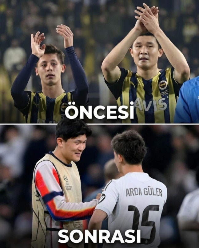 김민재가 이날 베르나베우에서 얻어간 건 승점 3만이 아니었다. 김민재는 경기 후 상대 선수와 인사를 나누던 중 한 선수와 뜨거운 포옹을 나눴다. 튀르키예 출신 미드필더 아르다 귈러(21)다. 둘은 마주 서서 한참 동안 웃으며 담소를 나눴고, 유니폼까지 교환했다.