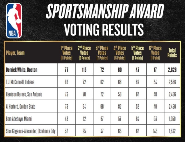 미국프로농구(NBA) 보스턴 셀틱스가 2년 연속 리그 스포츠맨십상(NBA Sportsmanship Award) 수상자를 배출했다.