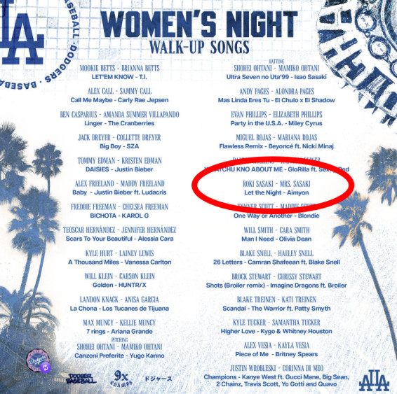 경기가 열린 현지시간 28일 밤은 '여성의 밤'으로, 다저스 선수들의 아내 혹은 여자친구가 등장곡을 골랐다. 다저스 구단은 이를 정리해서 선수와 그의 아내 이름을 같이 표기한 뒤 등장곡도 소개했다.