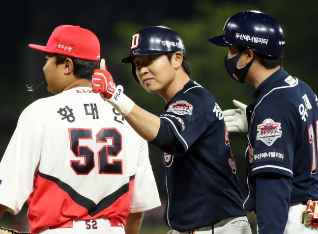 ▲ 결승타를 친 두산 베어스 정수빈(가운데) ⓒ 연합뉴스 [스포티비뉴스=광주, 김민경 기자] "무조…