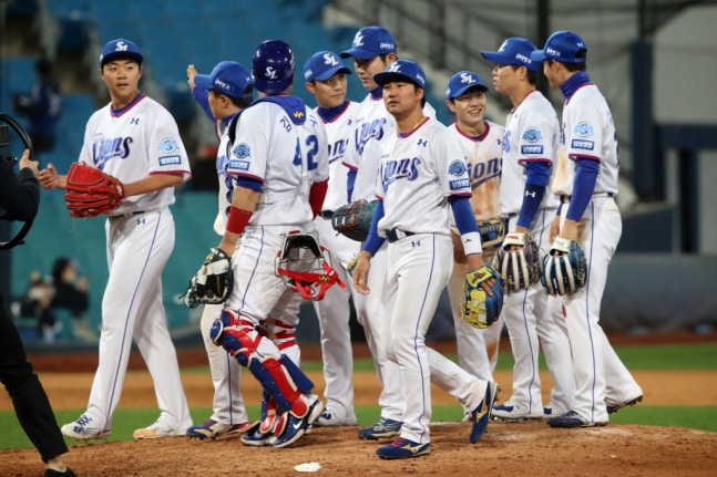 삼성 선수들이 14일 대구 한화전에서 승리한 뒤 기쁨을 나누고 있다. /사진=삼성 라이온즈 제공 SSG 김광…
