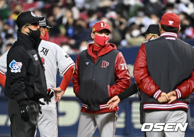 [OSEN=잠실, 지형준 기자]5회초 1사 1루에서 SSG 김원형 감독이 최지훈의 1루 땅볼 타구가 파울이라…