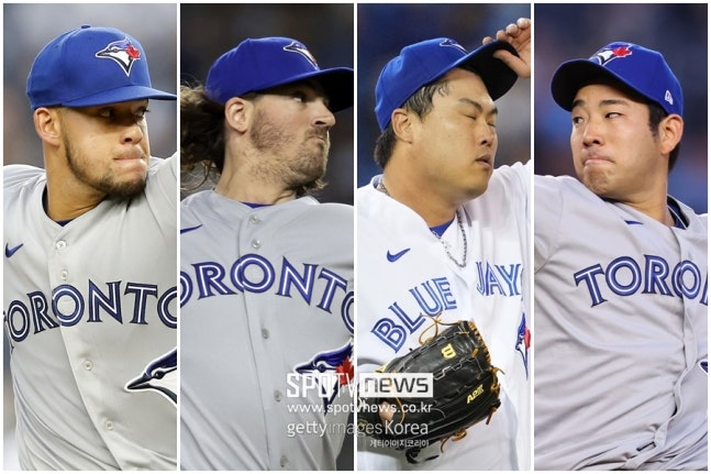 ▲ 왼쪽부터 토론토 블루제이스 호세 베리오스, 케빈 가우스먼, 류현진, 기쿠치 유세이 [스포티비뉴스=김민경 …