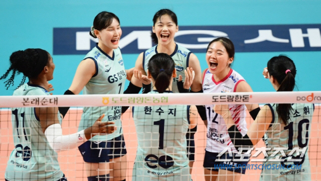 안혜진(왼쪽에서 두번째) 유서연(가운데)과 환호하는 GS 칼텍스 선수들. 스포츠조선DB [스포츠조선 김영록 …