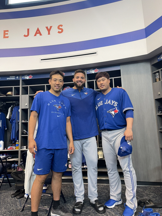 류현진(오른쪽)이 지난 3월 17일 토론토 블루제이스 라커룸에서 기쿠치 유세이(왼쪽), 알렉 마노아와 함께 …