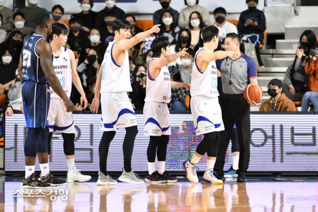 [스포츠경향] 프로농구 삼성 선수들이 지난 6일 열린 KCC와의 원정 경기 도중 심판 판정에 항의하고 있다.…