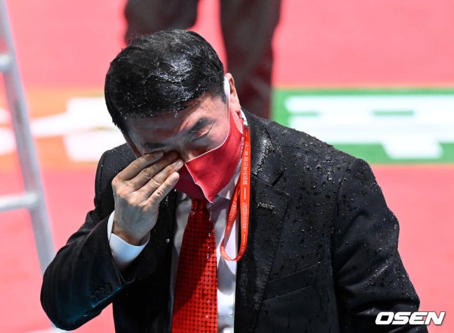 [OSEN=광주, 이대선 기자]경기 종료 후 페퍼저축은행 김형실 감독이 선수들에게 축하 물세례를 받고 닦아내…